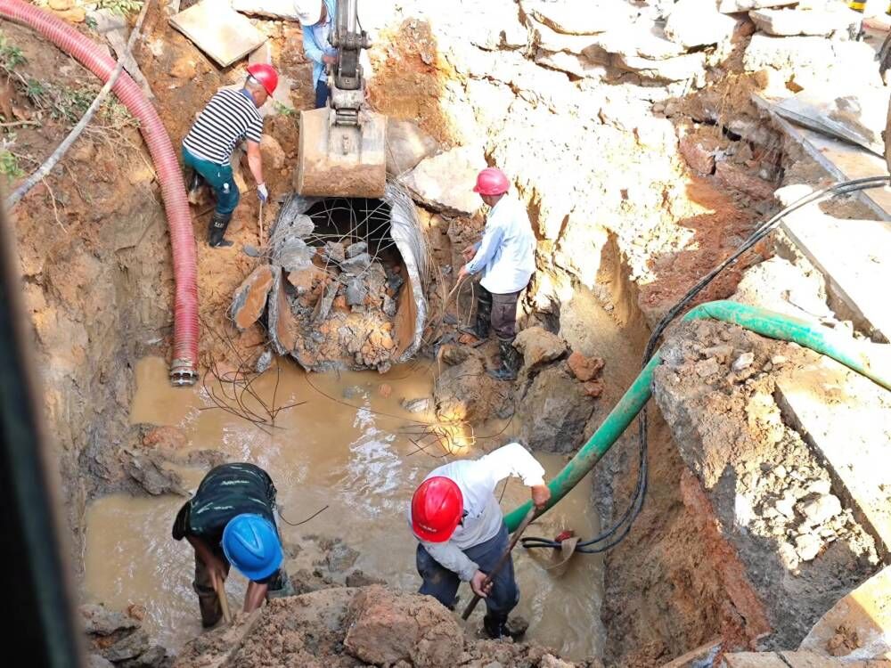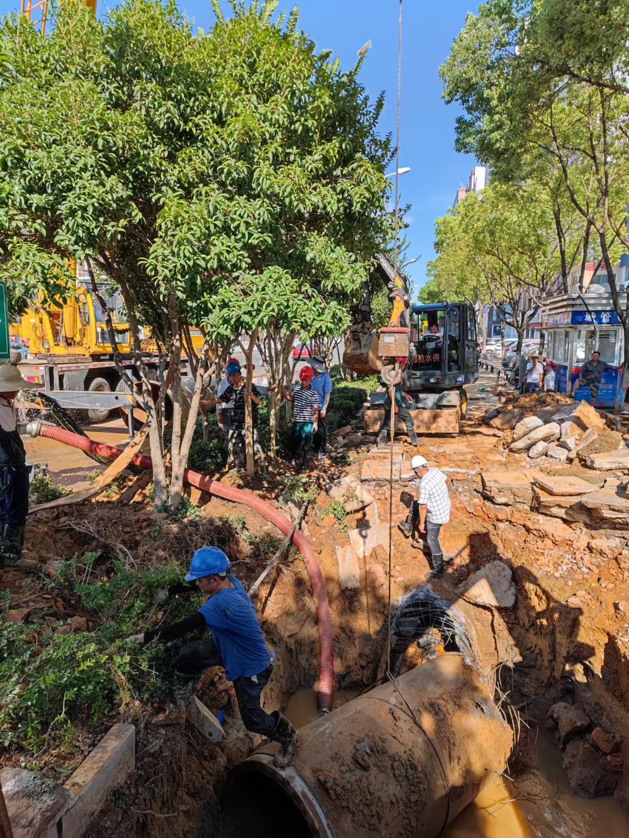 此次爆管口徑大,積水多,并且事發(fā)地位于交通主干道,周圍環(huán)境復(fù)雜,給協(xié)調(diào)開挖和排漬工作帶來不小困難。