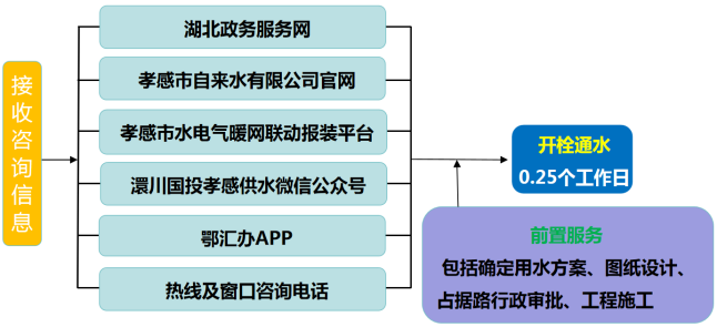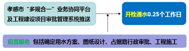 流程說(shuō)明:供水企業(yè)通過(guò)孝感市“多規(guī)合一”業(yè)務(wù)協(xié)同平臺(tái)及工程建設(shè)項(xiàng)目審批管理系統(tǒng)推送獲取項(xiàng)目建設(shè)信息后主動(dòng)對(duì)接,先行開(kāi)展確定用水方案、圖紙?jiān)O(shè)計(jì)、工程施工等服務(wù),辦理用水工程涉及的占道、掘路、占用綠地、伐移樹(shù)木等相關(guān)行政審批手續(xù),提前完成外線工程實(shí)施,為客戶提供“無(wú)感免申請(qǐng)”服務(wù)??蛻粜枰盟畷r(shí),0.25個(gè)工作日內(nèi)開(kāi)栓通水。
