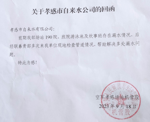 “真的太感謝你們了,沒有你們的幫助靠我們自己是真的修不好這漏水??!”9月20日下午,空軍孝感廠站機營股工作人員將一封感謝信送到了市自來水有限公司。
