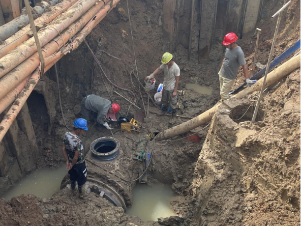 “老閥門不能完全關閉,深基坑內只能帶水作業(yè),邊抽水、邊開挖、邊打防護、邊調配件,施工難度大,進度慢。17號為保證市民用水,還臨時開機供水12小時,面臨的困難前所未有?!惫具\行維護部部長劉要華說。
