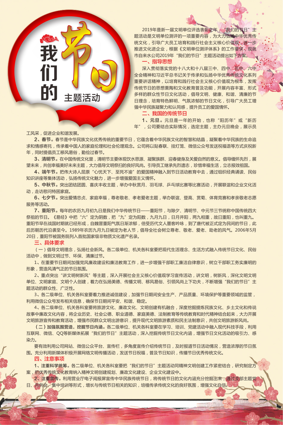 2019年是新一屆文明單位評(píng)選表彰之年,“我們的節(jié)日”主題活動(dòng)是文明單位測(cè)評(píng)的一項(xiàng)重要內(nèi)容,為大力弘揚(yáng)中華優(yōu)秀傳統(tǒng)文化,引導(dǎo)廣大員工培育和踐行社會(huì)主義核心價(jià)值觀,進(jìn)一步推進(jìn)文化進(jìn)企業(yè),根據(jù)《文明單位測(cè)評(píng)體系》的工作要求,現(xiàn)就市自來(lái)水公司2019年“我們的節(jié)日”主題活動(dòng)提出如下方案。