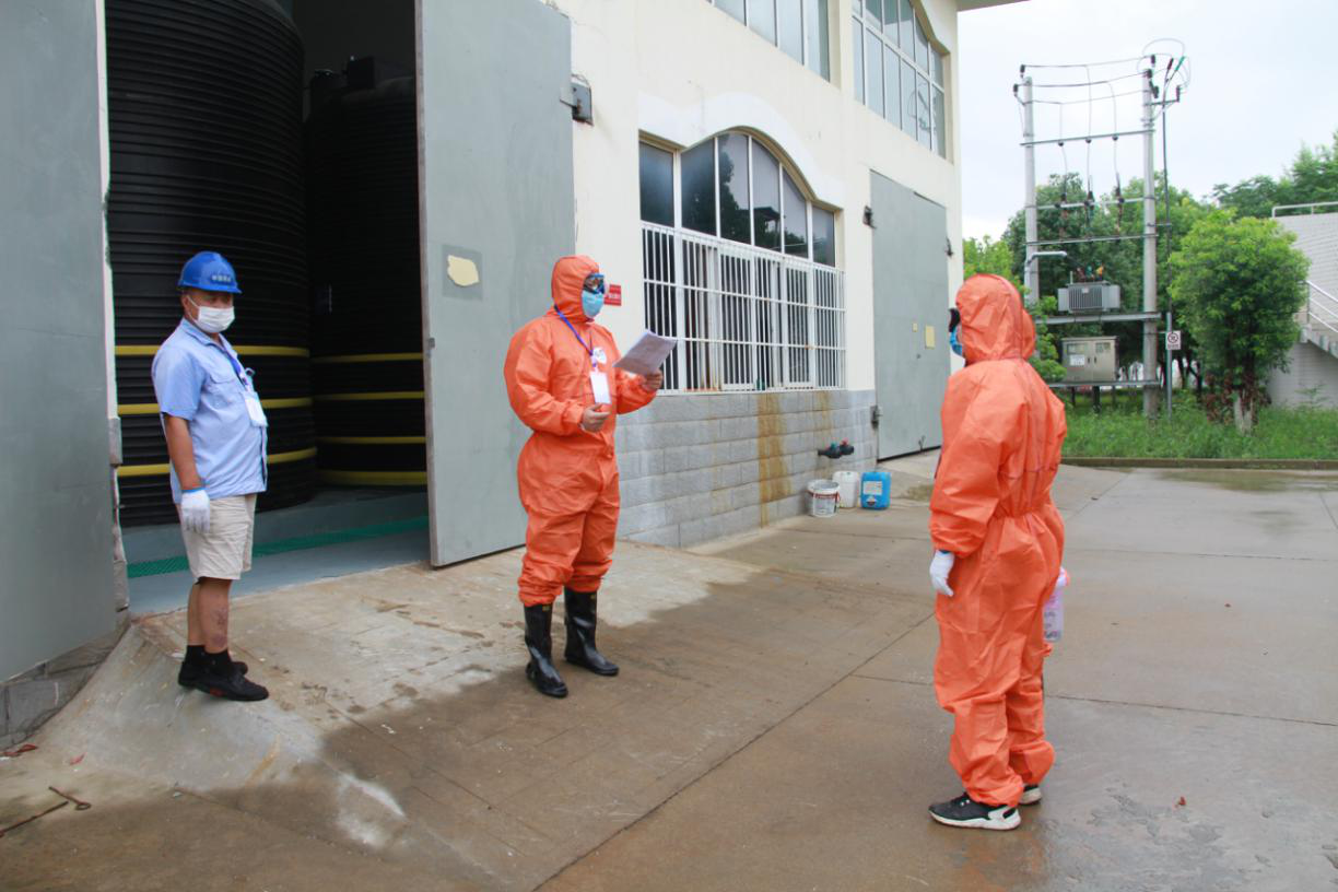 此次演練是以正在使用中的儲(chǔ)液罐的底部破裂,導(dǎo)致次氯酸鈉大量外泄為背景。當(dāng)天上午9:30分,演練正式開始。值班人員在巡視過程中被次氯酸鈉藥劑噴濺至手臂受傷,值班班長(zhǎng)立即報(bào)告總指揮,總指揮下令立刻全面啟動(dòng)次氯酸鈉應(yīng)急處置預(yù)案,通訊聯(lián)絡(luò)組、醫(yī)療救護(hù)組、安全疏散組、現(xiàn)場(chǎng)處置組前往現(xiàn)場(chǎng)開展救援及搶修。