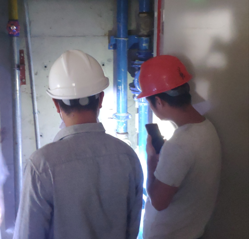 驗(yàn)收小組依次巡查了用水閘閥,入戶水表,供水管道,供水井蓋,二供泵房、樓頂水箱等供水設(shè)施,施工方全程參與。本次驗(yàn)收中發(fā)現(xiàn)4處管道井安裝不合格,部分管道油漆標(biāo)識(shí)不清晰,入戶水表前后管徑不一致、二供泵房未做防鼠設(shè)施等問題,當(dāng)即要求施工方整改。